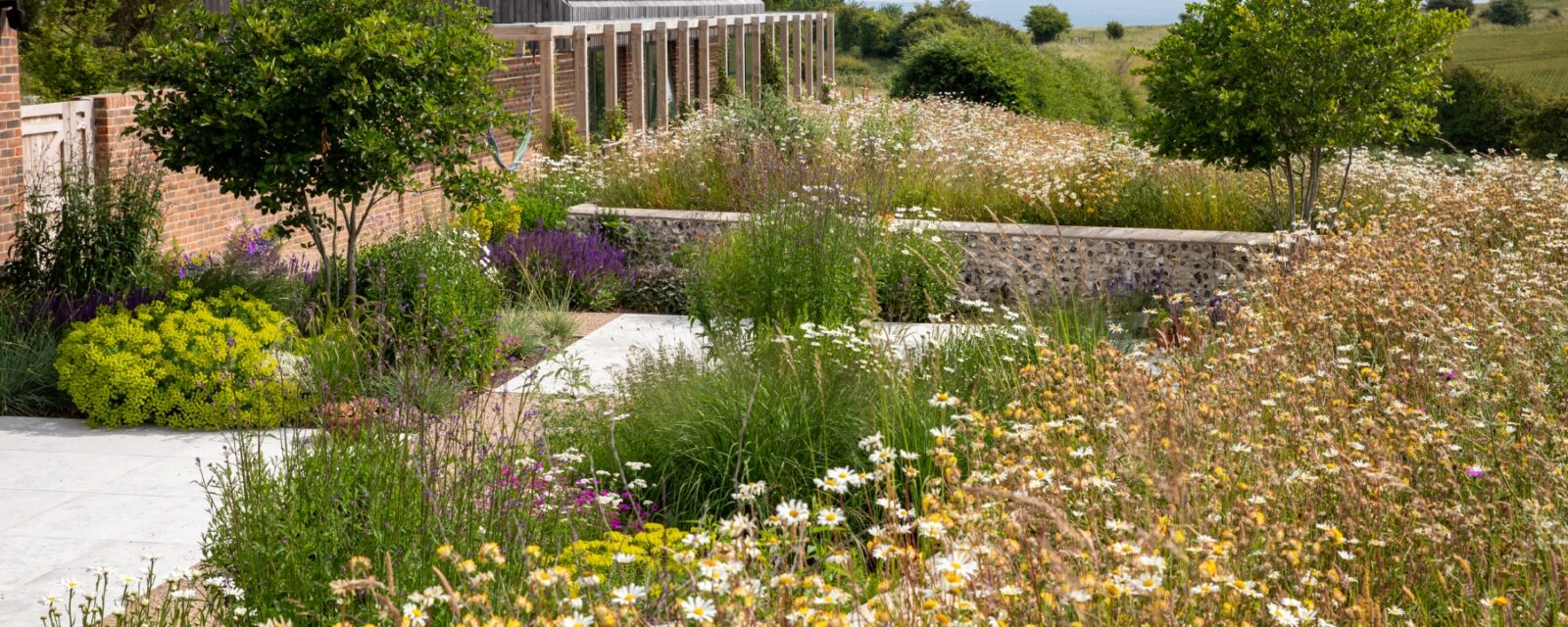 To match the ten acre home’s spectacular setting high in the South Downs, we have restored and created chalk downland meadows knitting the architecture into the landscape and worked closely with the South Downs National Park to create a sensitive intervention in the landscape. Around the buildings we created a series of semi sheltered gardens around the buildings that can tolerate extreme exposure in this stunning location.